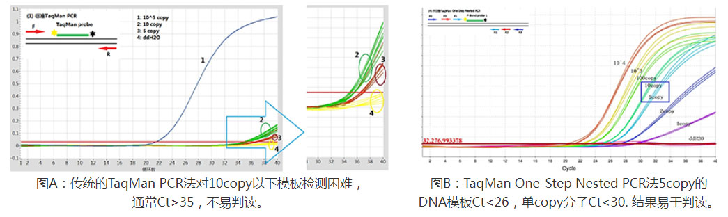 | TaqMan PCR和TaqMan One-Step Nested PCR的性能对比 | ||